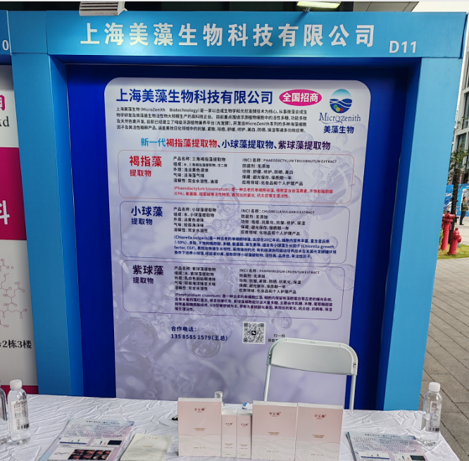 上海美藻生物受邀参展了本次论坛,展示了公司新一代三角褐指藻提取物、紫球藻提取物和小球藻提取物等多种藻类生物活性材料以及两款新产品早安雅小球藻精粹祛痘精华液和早安雅紫球藻抗皱紧致面膜。公司负责人表示:近期美妆行业也内卷严重,从终端品牌、到代工生产、再到上游原材料,价格战不断,在竞争激烈的行业唯有拥抱新技术才能形成竞争优势,公司正在利用微藻生物制造技术赋能国产品牌走向高端化、国际化,让中国美妆品牌,中国制造走向世界。