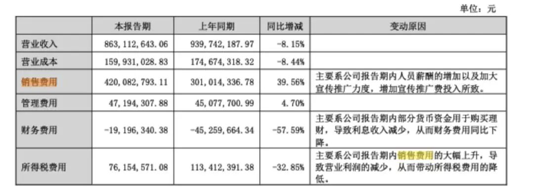 敷尔佳的收入主要来自医疗器械类产品(如医用修复贴)和化妆品类。其中,医疗器械类产品收入为2.38亿元,同比大跌48.07%,占总营收的27.61%。上半年销售费用高达4.20亿元,同比暴增39.56%,占营业收入的比例超48%。这意味着敷尔佳每收入1元,就有近0.5元花在营销上。